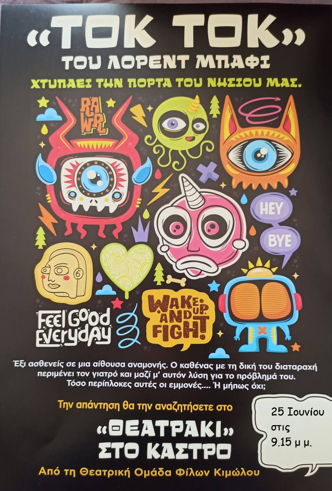 Θεατρική Ομάδα Φίλων Κιμώλου σας προσκαλεί το Σάββατο 25 Ιουνίου στις 9.15 στο κάστρο για να απολαύσετε την κωμωδία του Λοράν Μπαφί “TOC TOC”.