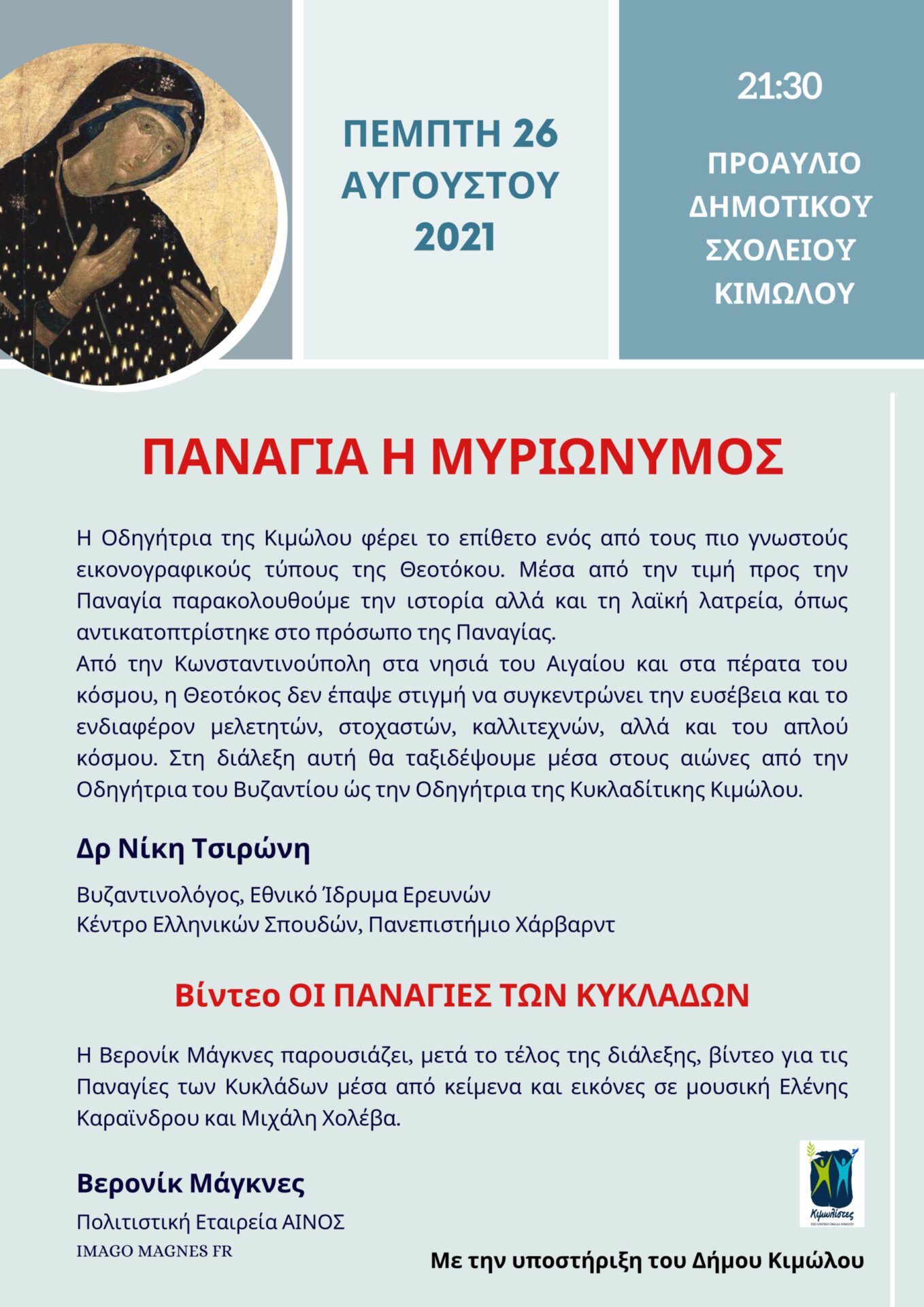 Από την Κωνσταντινούπολη στα νησιά του Αιγαίου και στα πέρατα του κόσμου, η Θεοτόκος δεν έπαψε στιγμή να συγκεντρώνει την ευσέβεια και το ενδιαφέρον μελετητών, στοχαστών, καλλιτεχνών, αλλά και του απλού κόσμου. Στη διάλεξη αυτή θα ταξιδέψουμε μέσα στους αιώνες από την Οδηγήτρια του Βυζαντίου ώς την Οδηγήτρια της Κυκλαδίτικης Κιμώλου.