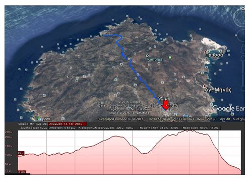 Down to the right you see in another Kalderimi the island’s only old stone bridge and the eastern crossing of paths and roads on the island. Continuing on to the Xevri’s site you see around the scattered chapels of the Kimolian Countryside and the view of the geological relief of the almost round island. Going up, you’ll reach a dirt road that upon following it, you’ll find yourself on a dirt road crossing.