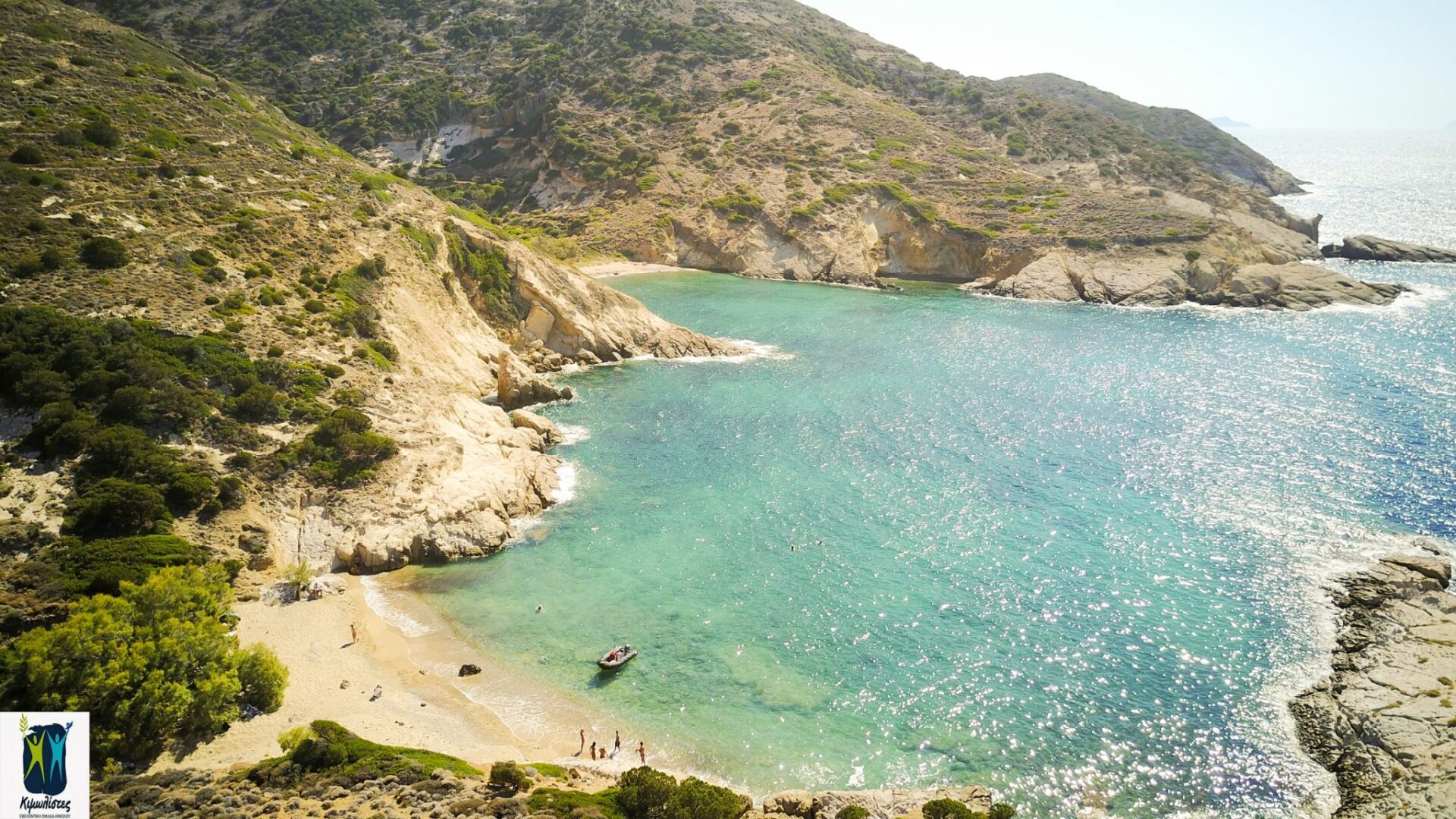 The downhill path passes through ruins of farmlands and through olive groves and pins ends up on the beach of Agioklima. By swimming you can reach the little Fidaki beach, where very hot water flows from a spring into the sea.