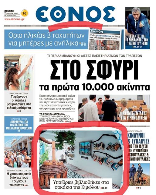Δισέλιδο αφιέρωμα για την ανοιχτη βιβλιοθήκη στην εφημερίδα έθνος(απο την Κατερινα Τζουμερκιωτη 7-7-16).