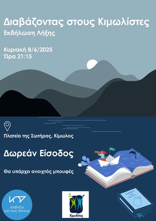 Την Κυριακή 8 Ιουνίου θα πραγματοποιηθεί η εκδήλωση λήξης της δράσης «Διαβάζοντας στους Κιμωλίστες» στην Πλατεία της Σωτήρας της Κιμώλου στις 21:15